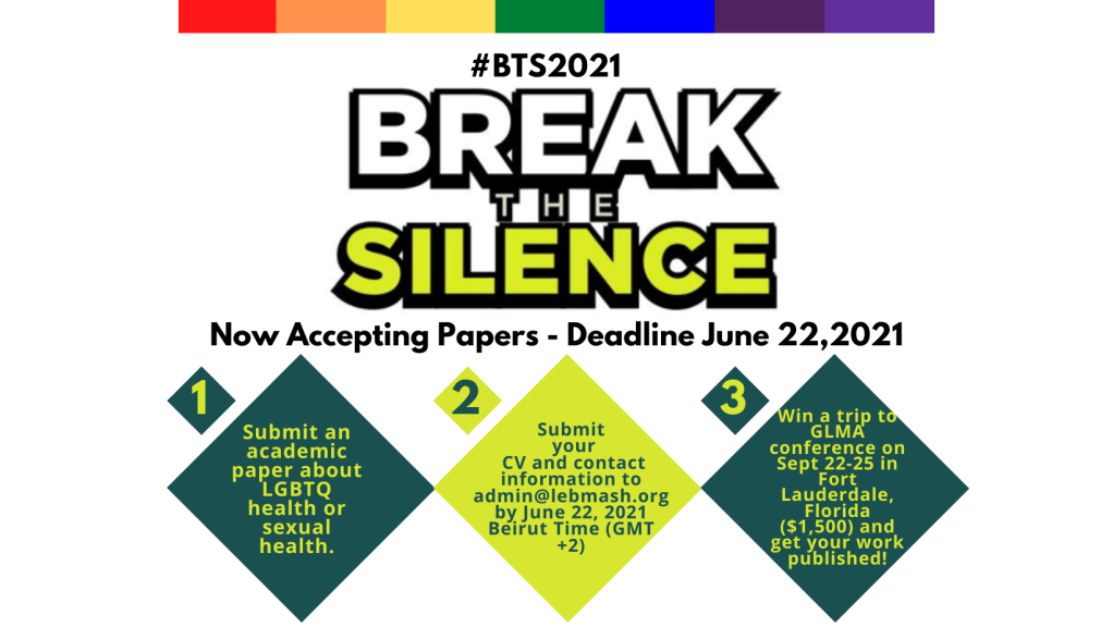 The Lebanese Medical Association for Sexual Health LebMASH calls on students in any health field who are interested in sexual health and LGBT (Lesbian, Gay, Bisexual and Transgender) health to apply for the annual “Break the Silence” grant.