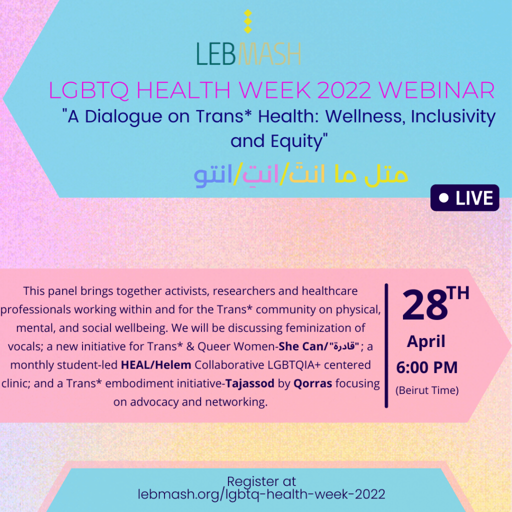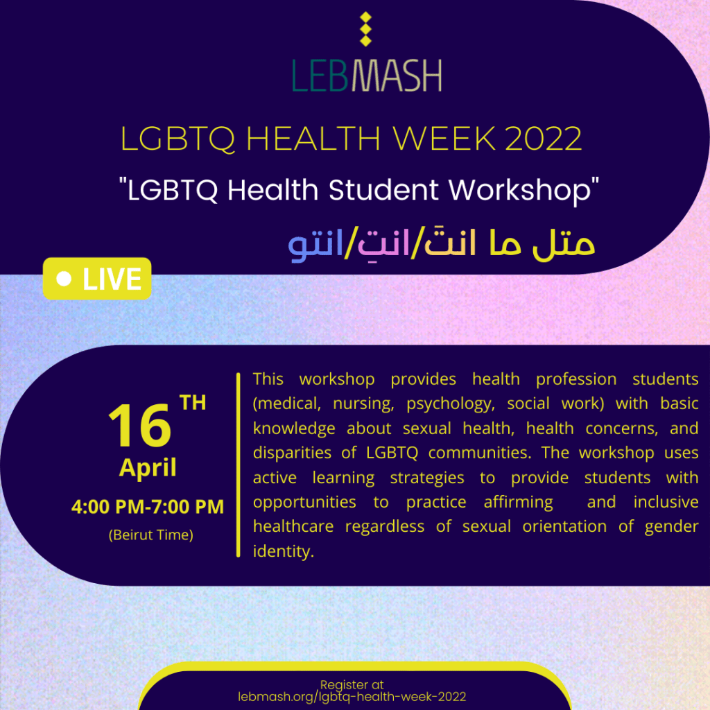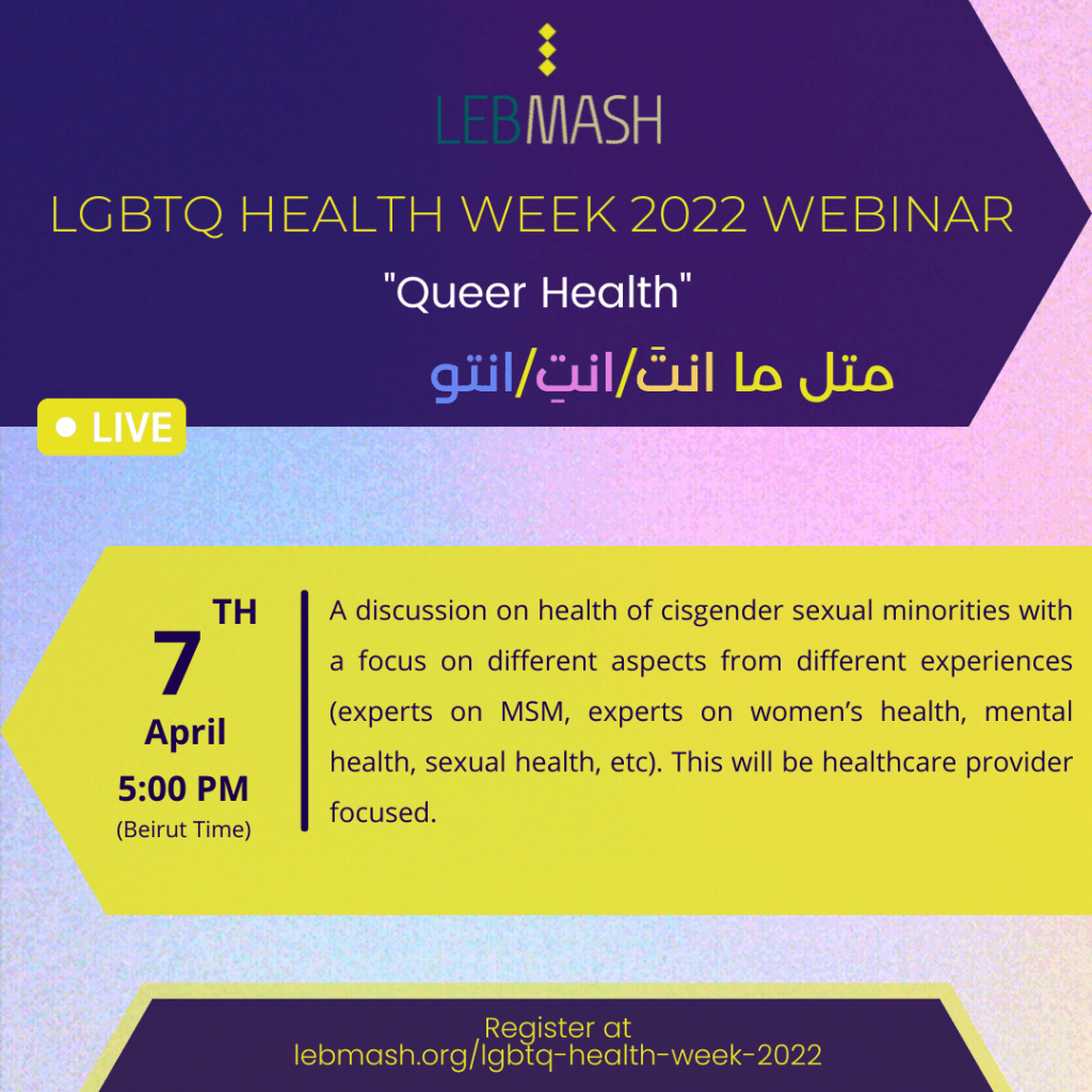 LebMASH’s 6th Annual LGBTQ Health Week is back! Join us for a series of webinars and trainings through which we will host several discussions to talk about LGBTQ health with focus on youth health, mental health, and sexual health.